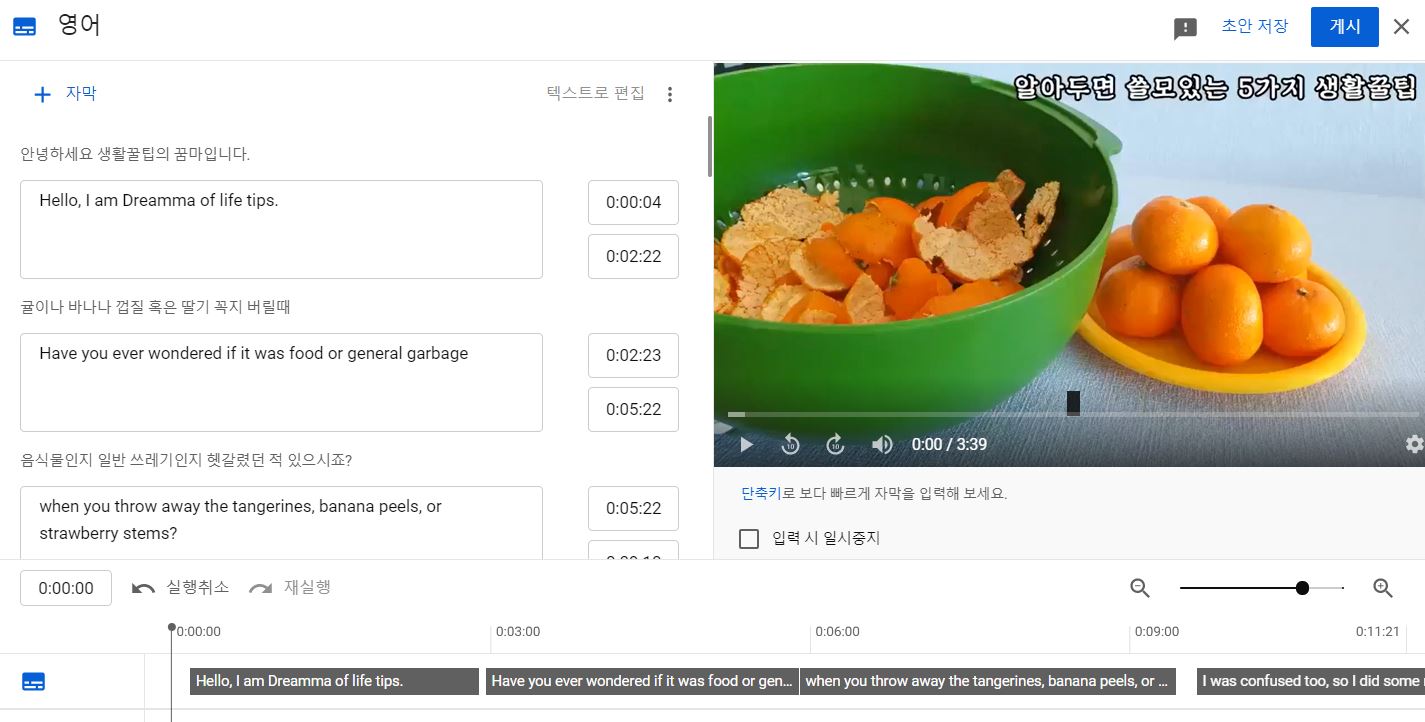 어떤 자막은 아래 타임라인에 맞춰 수정해야 하더라구요.