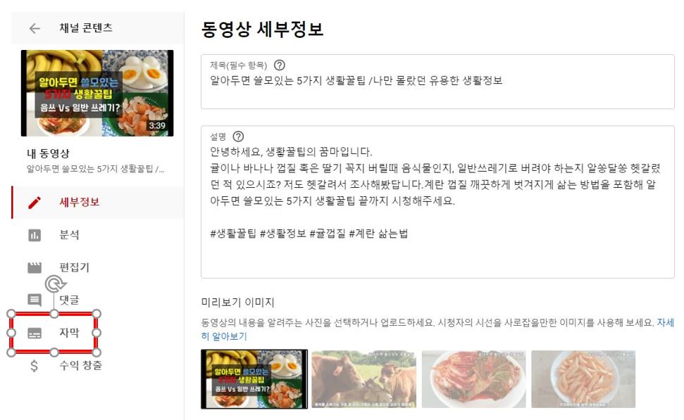 해당 영상 세부정보에 자막 클릭