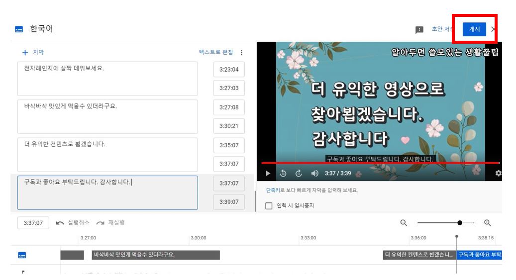 게시를 클릭하면 한국어 자막이 추가됩니다.